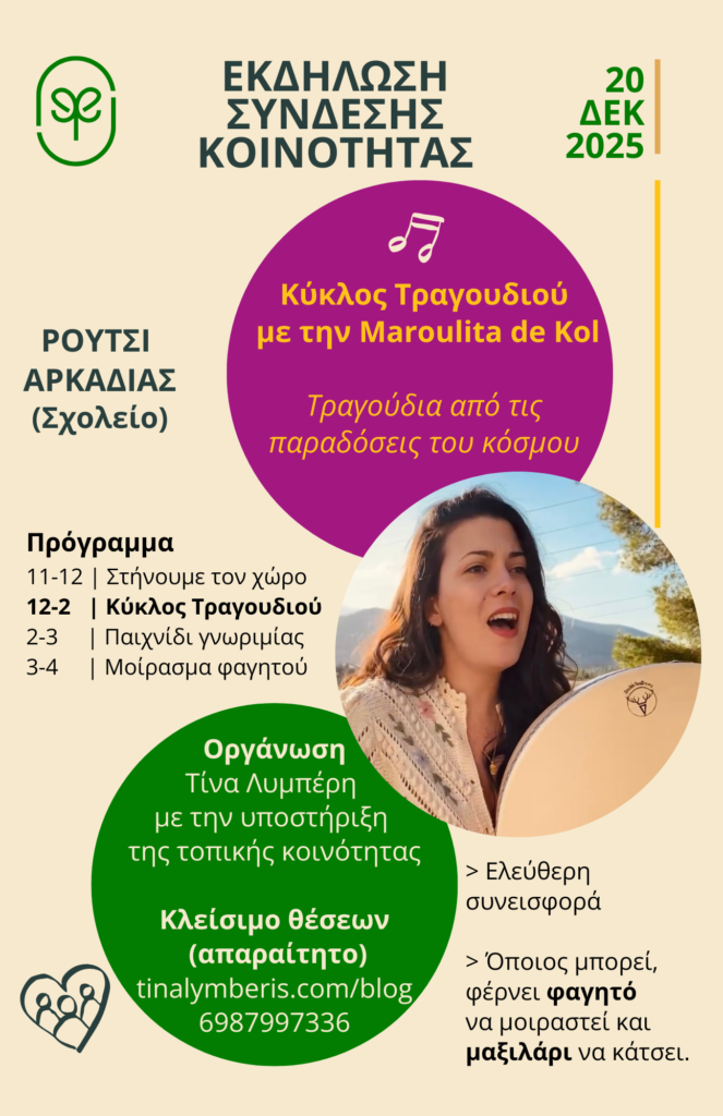 Οι Εκδηλώσεις Σύνδεσης Κοινότητας έχουν πλέον νόημα για μένα, γιατί επιτέλους καταστάλαξα στο ημι-ορεινό χωριό Ρούτσι Αρκαδίας, όπου εγκαταστάθηκα πριν από 1.5 χρόνο, με γειτόνισσες τις υπέροχες βελανιδιές. Τώρα είμαι έτοιμη να γνωρίσω επίσης τους ανθρώπινους γείτονές μου – τους συνοδοιπόρους μου σε αυτή την περιοχή που τους αρέσει η ιδέα να συνδεθούμε, να μοιραστούμε, να συν-οραματιστούμε και να συν-δημιουργήσουμε!